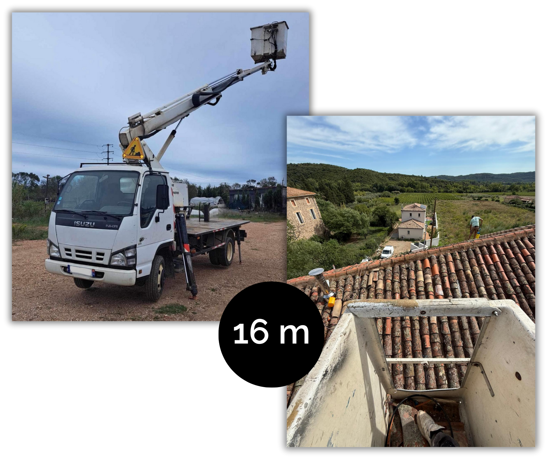 L’utilisation du camion nacelle permet d’atteindre facilement les hauteurs sans échafaudage. Nous procédons à un nettoyage en douceur, adapté à chaque surface (tuiles, crépis, bardages, panneaux solaires).